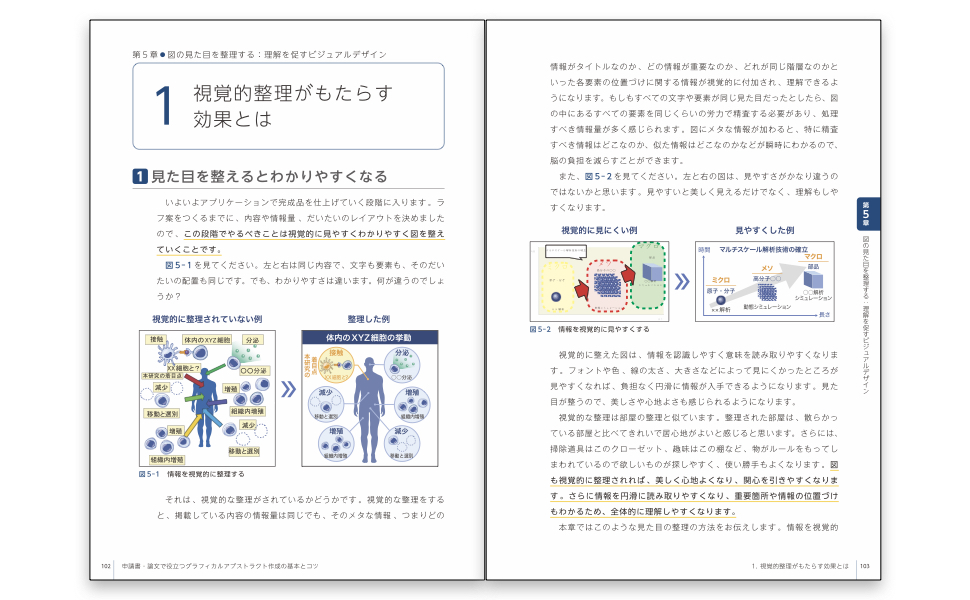 図の見た目の整え方だけでなく、本書は研究などの複雑で情報量が多いことがらを、1つの図にまとめるための考え方と方法を解説します