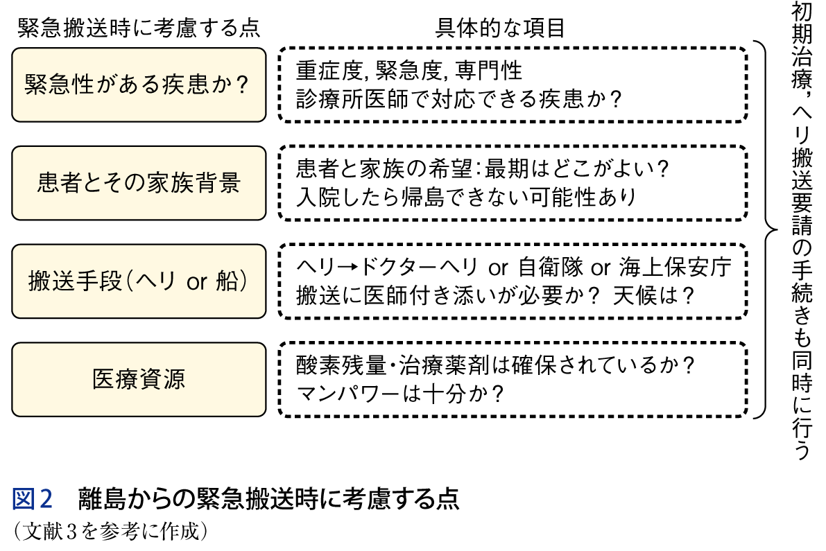 通常の外来診療と並行して急患に対応しなければならない場面もあります.そのため,離島において通常の家庭医療の現場と最も異なるのが緊急疾患対応の力であり,緊急疾患への対応ができなければ離島勤務は困難2)となります.図2に緊急搬送時に考慮すべきことを示します.搬送手段としては,ヘリ搬送と船搬送に分けられます.船搬送は天候にも左右され,また搬送中は医師の付き添いがない(船搬送に付き添うとその間,長期に渡り,島に医師が不在となる)ため,医師付き添いが必要な緊急患者はヘリ搬送となります.