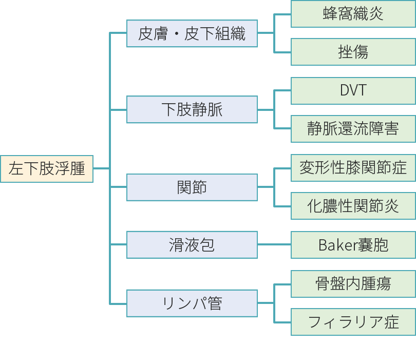 専攻医:浮腫を悪化させている一因になっている可能性はあるけれど,ほかにも片側性浮腫をきたすような原因があると考えたほうがいいわ.指導医先生もいないし,今回は私たちだけでロジックツリーを作っていきましょう.