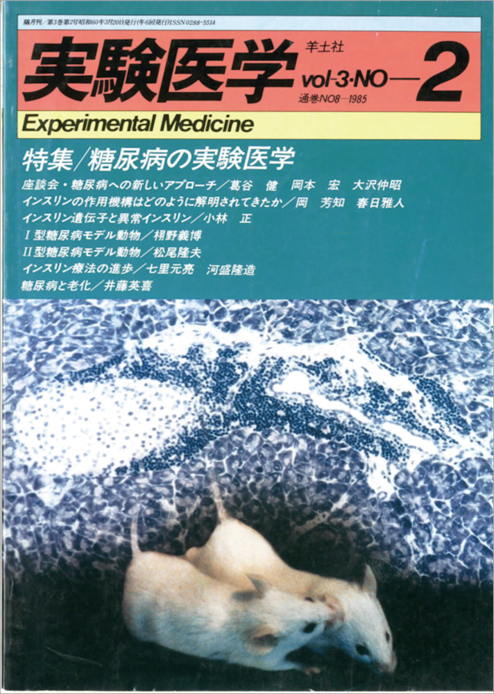 今月は「糖尿病の実験医学」と題して,“古くて新しい疾病”糖尿病を葛谷健先生に特集していただきました.遺伝子組換によってヒトインスリンがつくられるようにはなりましたが,糖尿病の発症原因には,まだ多くの疑問が残っています.これからの研究に注目,皆様にお届けして行きたいと思います.