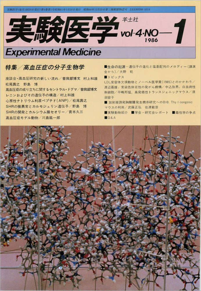 今号は「高血圧症の分子生物学」と題して,曽我部博文先生に特集をご企画いただきました.高血圧症の研究では,分子生物学レベルでのホルモンのペプチド構造の解明,利尿作用との関係なども研究され,それらの高血圧との詳細な関係,その作用のつながりの解明など多岐にわたって研究が進んでいます.