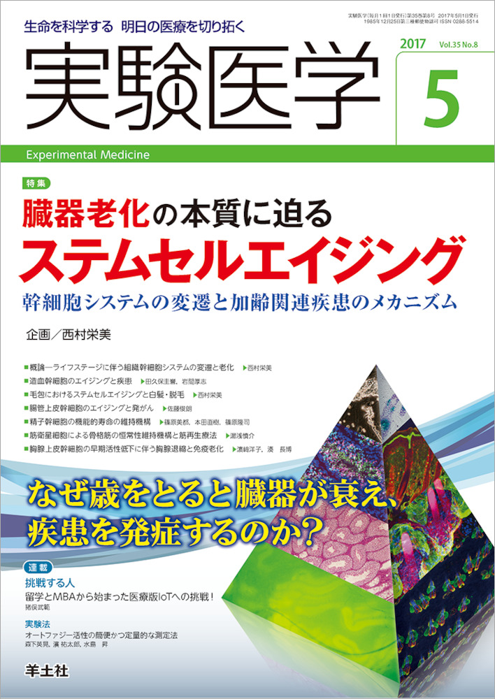 - 【本書名】実験医学:臓器老化の本質に迫るステムセルエイジング〜幹細胞システムの変遷と加齢関連疾患のメカニズム