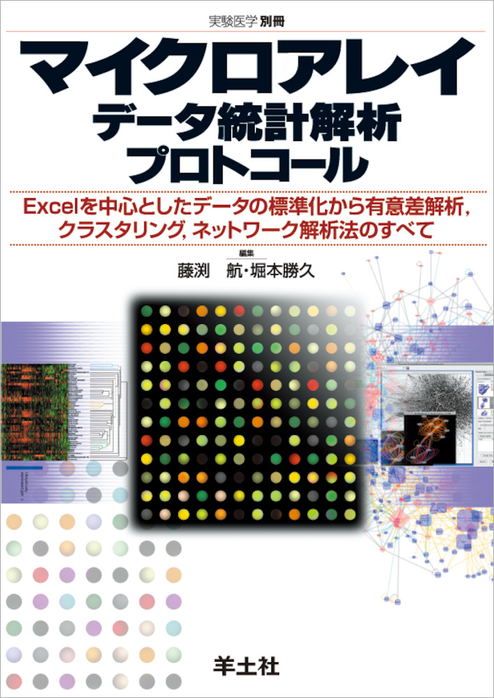 • 【本書名】実験医学別冊:マイクロアレイデータ統計解析プロトコール〜Excelを中心としたデータの標準化から有意差解析,クラスタリング, ネットワーク解析法のすべて