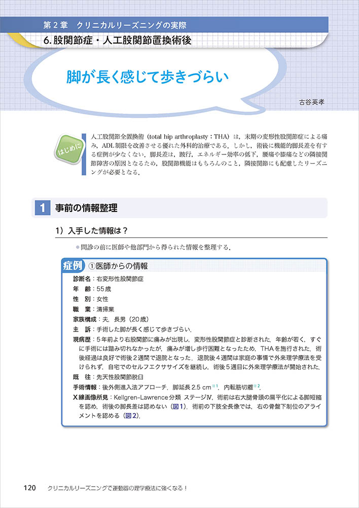 第1章では,クリニカルリーズニングの定義と学習方法が初学者でも分かるように丁寧に書かれている.そして,第2章では,運動器分野で臨床経験豊富な理学療法士が,非特異的腰痛症,肩関節周囲炎,股・膝関節症,膝前十字靱帯損傷,足関節捻挫,サルコペニアなど11の疾患(症候)を例に,①仮説の立案,②具体的評価,③治療,そして,④再評価と無駄な情報が全くなく,実にシンプルかつ明快に解説がなされている.