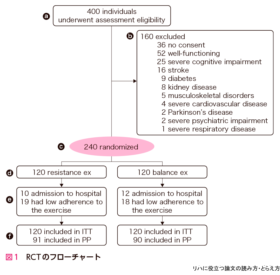 • ITT(intention to treat)解析の対象は両群ともに120名であり,プロトコールを遵守できたものに対する分析〔PP(per protocol)解析〕の対象はレジスタンス運動群で91名,バランス運動群で90名であった.