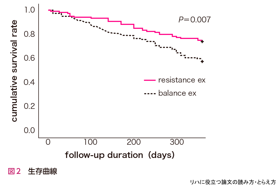 図やグラフは論文のなかでも目に留まりやすいものであり,結果を解釈するうえで重要な役割を果たす.図2に示した生存曲線※1だけでなく,棒グラフ,折れ線グラフ,円グラフはそれぞれ特徴があり,いずれも直感的に結果を理解するのに役立つ.図2は,レジスタンス運動群とバランス運動群で,介入終了後の要介護状態の発生割合に差があることを示している.