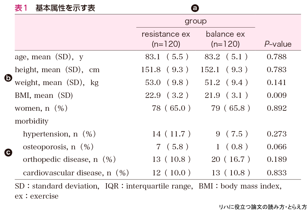 基本属性を示す表は,対象者の特性を把握するうえで重要である.人口統計学的データだけでなく,結果に影響を及ぼしうるような臨床特性が示される.表1に一例を示し,これをもとに説明する.
