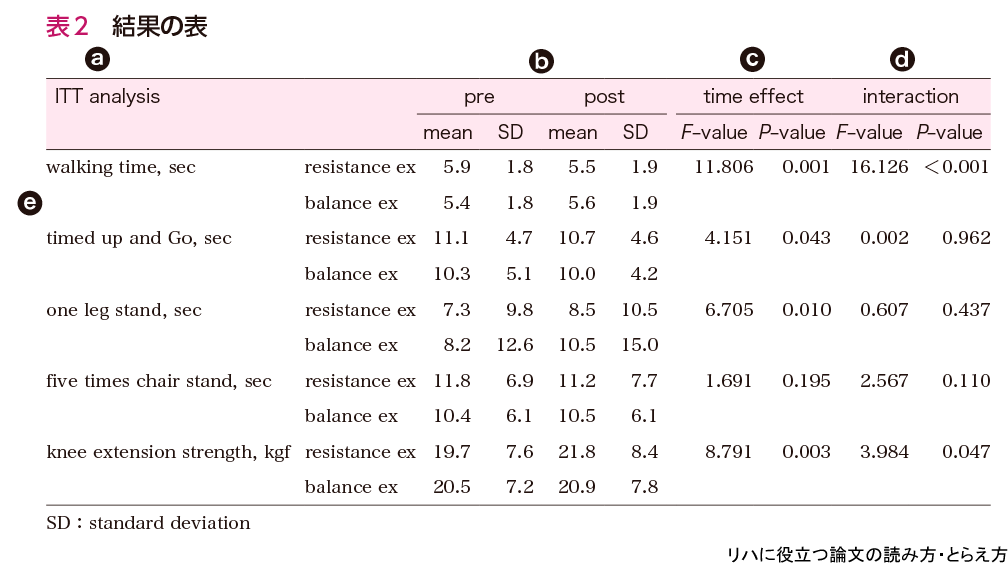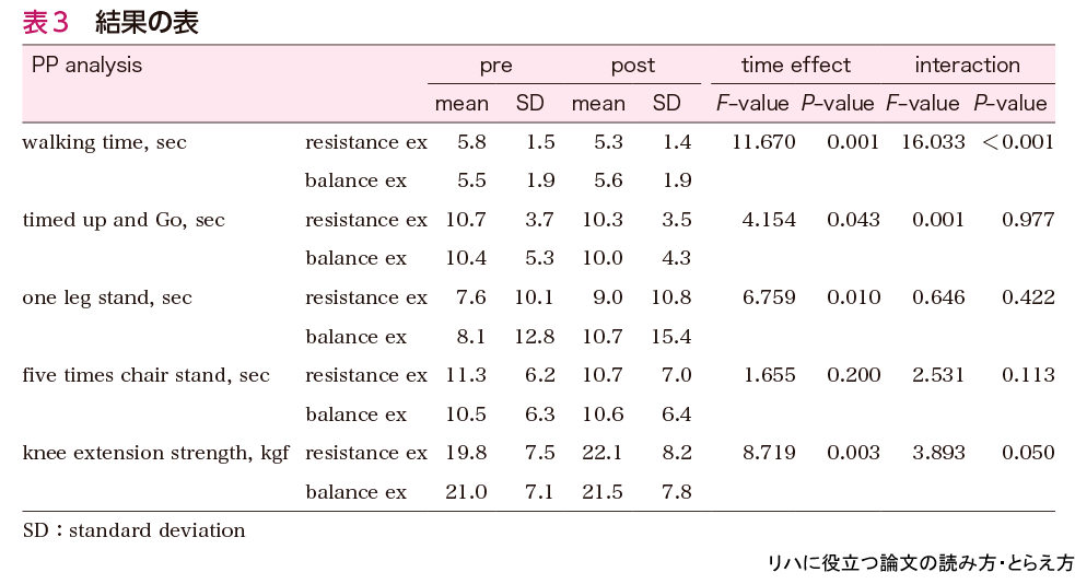 - ITT(intention to treat)解析の対象は両群ともに120名であり,プロトコールを遵守できたものに対する分析〔PP(per protocol)解析〕の対象はレジスタンス運動群で91名,バランス運動群で90名であった.