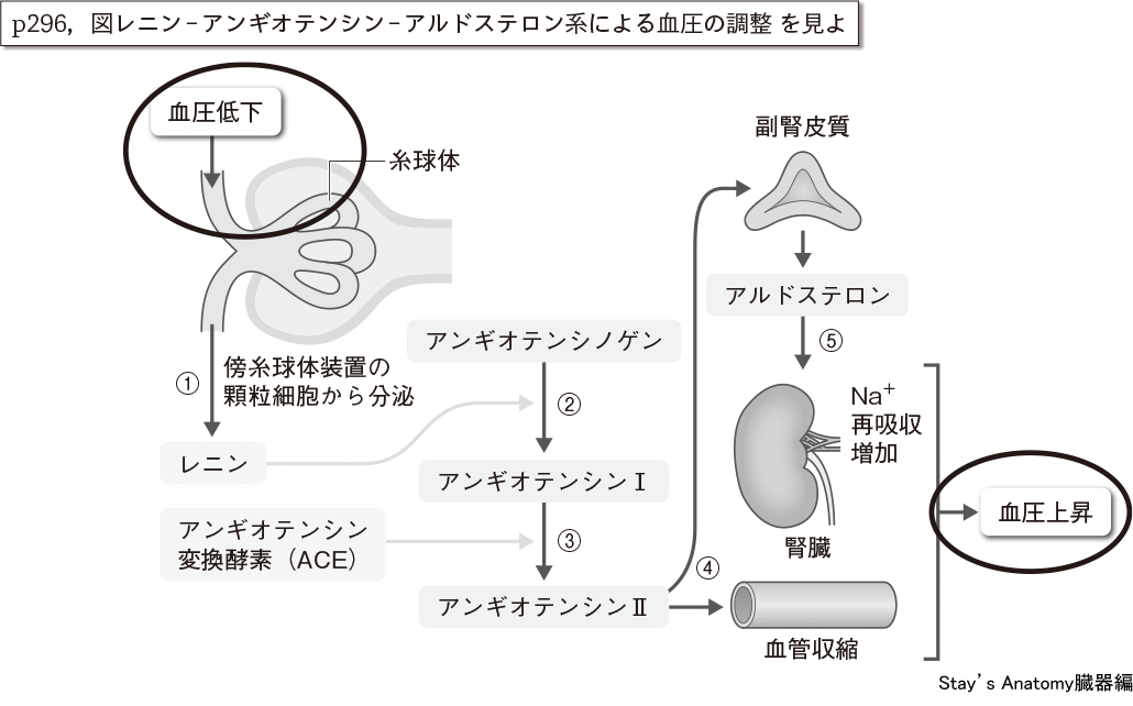 非常に作用の過程が長いんですが,まずは最初と最後だけ見ましょう.RAA系の一連の働きは血圧の低下から始まり,そして血圧の上昇で終わっています.