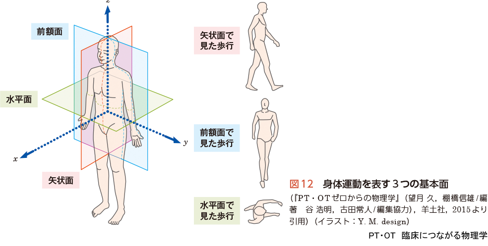 身体の位置や運動も座標を用いて表す.身体は大きさをもっており,頭部,頸部,体幹,上肢,下肢などの身体部位(体節)に分けられる.身体の運動を表すときは,身体の特定の点※1を決め,その特定の点が空間座標の中でどのように運動するかという視点と,身体部位の相対的な位置関係が時間とともにどのように変化していくかという2つの視点がある.