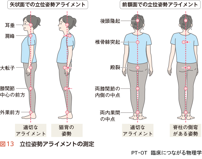 立位姿勢アライメントの測定では,鉛直線を基準として,前額面では後頭隆起・