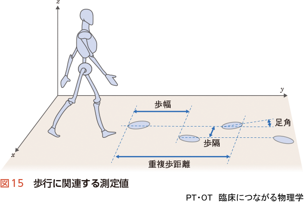 歩行に関連する測定値として,1歩分の距離である歩幅(ステップ長),2歩分の距離である重複歩距離,左右の