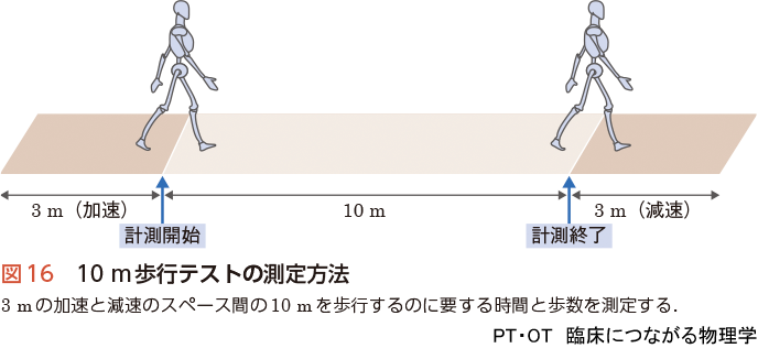 速度に関して,臨床において最も頻繁に用いられるのは歩行速度の測定である.10 m歩行テストがその代表である.10 m歩行テストは,10 mの直線路とその前後に3 mずつの加速と減速用のスペースを設け,中央の10 mを歩行するのに要する時間を測定する.時間を測るのと同時に,最初に10 mの開始ラインを超えたときを1歩として,終了ラインを超えるまでに何歩を要したかも測定する(図16).歩行速度は,10 mを10 m歩行に要した時間(秒)で割って計算する.10 mを10秒で歩くと歩行速度は1 m/s※2となり,健常ではゆっくりとした歩行速度になる.歩幅は10 mを歩数で割って計算する.また,歩数を時間(分または秒)で割ると,単位時間あたりの歩数である歩行率(ケイデンス)が計算できる.