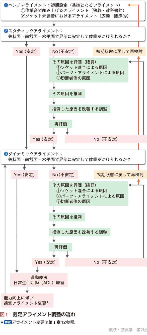 - 義足アライメントは,ベンチアライメント(bench alignment),スタティックアライメント(static alignment),ダイナミックアライメント(dynamic alignment)の3工程を経て調整する※1(図1).