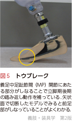 - トウブレークとは,歩行時の立脚期後期の踏み返しを円滑に行うために重要な義足中足趾節間(MP)関節のしなる部位のことである(図5).