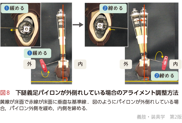 - 前額面で膝継手が作業台(床面)に対して水平でない場合(パイロンが外倒れしている場合)には,図8のようにアライメント調整する.