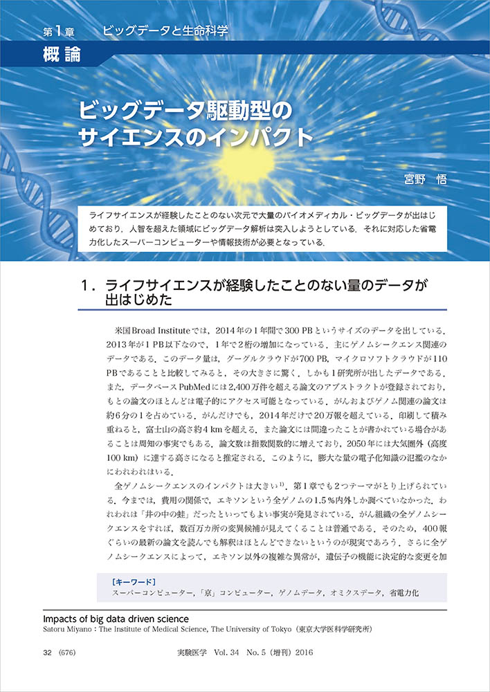- 【本書名】実験医学増刊:ビッグデータ 変革する生命科学・医療〜激増するオミクスデータ・医療データとどう向き合い、どう活用すべきか?