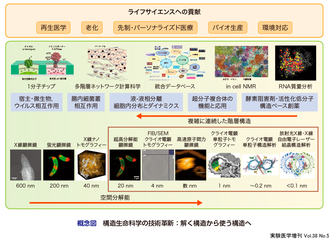 「構造生命科学」研究を進めるうえで生体高分子が溶液中,結晶中,そして,実際の細胞内もしくは細胞間で機能発現している様を必要な時間,空間分解能で観察することは第一義的に重要である.解明したい現象が複雑になればなるほど,それに必要な解析技術は高度化し,要求も高くなってくる.第1章ではJST「構造生命科学」研究領域期間中に内外で大きく進展した重要な基盤技術について各分野の第一線研究者により,研究手法と解かれた構造の意義,インパクトを紹介する.本概論では,それぞれの技術革新が構造生命科学研究にもたらす意義と技術開発の状況,ボトルネック,開発課題などについて将来を見越して概観する.