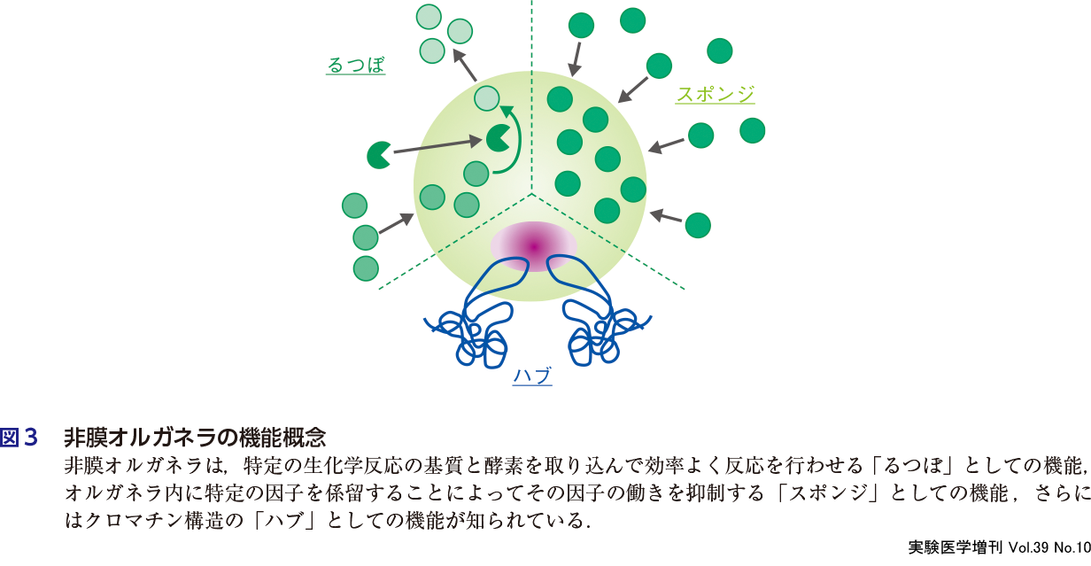 細胞内で相分離空間を形成することには,どのような意義があるのだろうか? 非膜オルガネラの機能としては,古典的な核小体でのリボソーム生合成のような巨大分子装置の工場としての機能があげられる.こうした工場では一連の生化学反応が効率よく順序立てて行われる必要があり,それが相分離によって隔離された空間に高濃度に集められた因子が,さらに内部で層構造を形成することによって行われている.こうした働きは,別名「るつぼ機能」ともよばれる(図3)4).一方で,特異的な因子を選択的に相分離空間に係留することによって,それらの因子が果たしていた機能を抑える働きも知られており,「スポンジ機能」とよばれている(図3)4).さらに核内では,非膜オルガネラはクロマチン領域の間隙に存在しているが,実際にクロマチンと相互作用することによって特定のクロマチン領域の配置や活性に影響を与える「ハブ」としての働きも提唱されている(図3)4)8)9).こうした分子機構に関する知見に加え,相分離現象がさまざまな細胞レベルおよび個体レベルでの生理現象に広くかかわっていることを示す知見が次々と報告されている.RNAやDNAがかかわる遺伝子発現だけでなく,タンパク質分解,細胞骨格重合,シグナル伝達,さらにはオートファジーといった多彩な細胞内現象にかかわる多くの因子が天然変性領域をもっており,それらを介した相分離現象がこれらの生体現象の特異性や効率などを制御していることが明らかにされている10).真核生物のタンパク質の30%以上は天然変性領域をもっているという報告もあり11),これらの多くが相分離現象を引き起こすとすれば,広範な生体内現象には,何らかの形で相分離がかかわっていることが予想される.本書の第3章では,最近明らかになってきた相分離を介して行われる生理現象についての知見を紹介する.