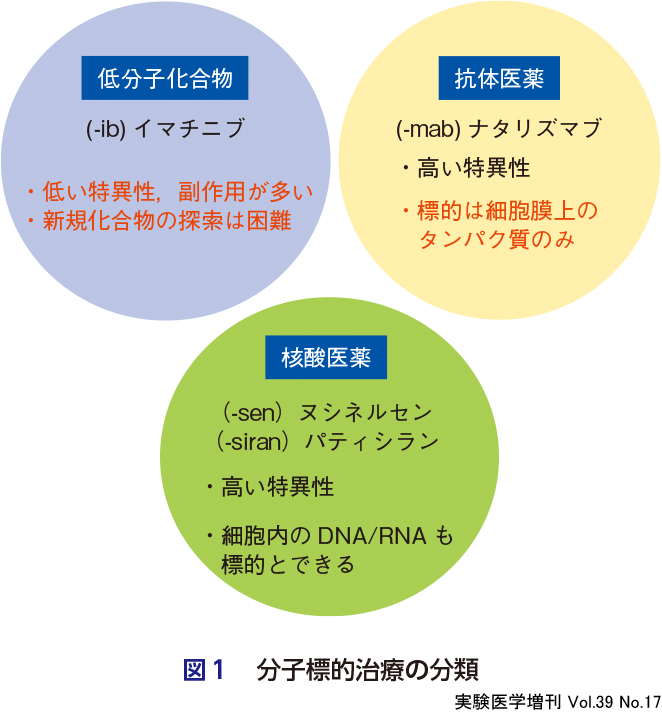 また,近年核酸医薬はペプチド医薬と並んで中分子医薬との位置づけもされるようになった.それは,この両者は低分子医薬より標的特異性が高いことと,抗体医薬と異なって細胞膜を通過して細胞内に自身で導入可能な点,化学合成が可能な点が特徴とされる.