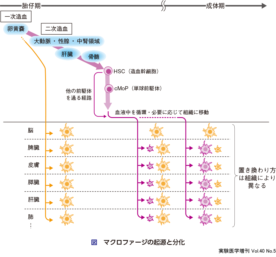 本書ではその起源について章立てて触れていないので,以下にその補足を述べる.現在,マクロファージの起源は,胎生期の卵黄嚢由来で胎仔から生体になった後も組織に分布しているマクロファージと,骨髄の前駆体由来でそれが組織に遊走して住み着く常在型マクロファージとに分けられる.この歴史について繙くと,1968年にFurthやCohnらの研究者は,前駆体から単球が出現して血中に流れ,その血中に漂っている単球が必要に応じて末梢組織に移動し,マクロファージに分化するというmononuclear phagocyte system(MSP)とよばれる概念を提唱した2)3).その一方で,造血システムは胎児期の卵黄嚢の一次造血から大動脈・性腺・中腎領域での二次造血が行われ,そこで初めて血管内皮細胞から造血幹細胞が発生し,そして胎仔の肝臓から骨髄へと造血の場が移行する.リンパ球など他の免疫細胞と同様に単球はこの肝臓や骨髄の造血幹細胞から発生するが,単球から分化するマクロファージは,その単球が造血幹細胞から発生するよりも前の段階の内胚葉由来卵黄嚢の血島に出現することから,このMSPという概念は一部破綻が生じているとも考えられる.近年,c-myb−/−造血幹細胞や,Cx3cr1のレポーターマウスを用いた実験から,脾臓・皮膚・膵臓・肝臓に存在するマクロファージの前駆細胞が,若い間は卵黄嚢に由来することが示された4)〜6).しかし,骨髄に存在している造血幹細胞を移植すると,組織に存在するマクロファージが脳以外の脾臓や肝臓などさまざまな末梢組織に出現することから,やはりマクロファージは骨髄の造血幹細胞から分化することもできる.これは成長の過程において,体の内部・外部からの刺激に応じて,卵黄嚢由来のものが骨髄由来に置き換わると考えられる.マクロファージの起源はこのように考えられている(図).