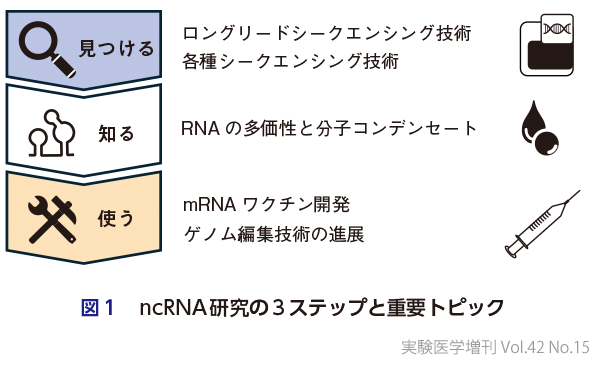 いま,ノンコーディングRNA(ncRNA)研究が再び熱を帯びてきている.ノンコーディングRNAの研究というよりも,RNA研究全体が大きな熱を帯びた転換期を迎えつつある,と言ったほうがよいかもしれない.一般に,遺伝子を中心とした分子生物学の研究は,「見つける」,「知る」,「使う」,の3つの段階を踏みながら発展していくものであるが,ncRNA研究界隈では,過去5年ほどの間に,そのすべてのステップにおいて大きな出来事があった(図1).