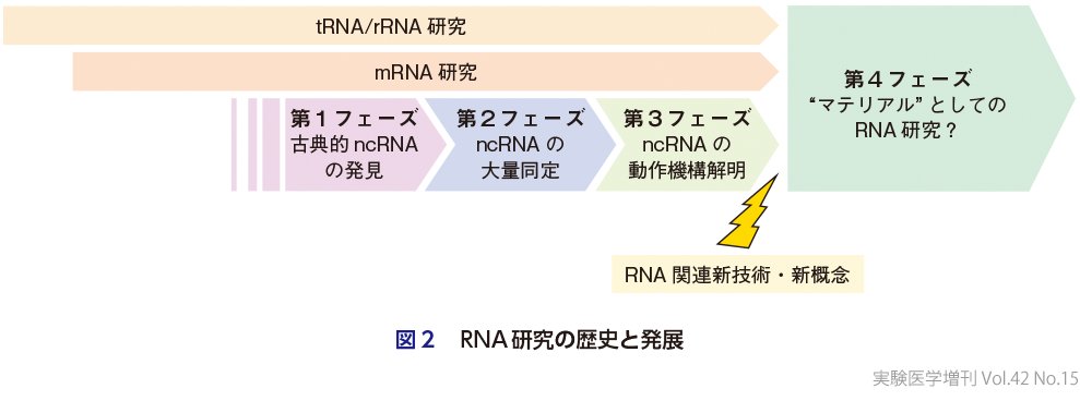 ここで改めてncRNA研究の歴史を振り返ってみると,遺伝学的な解析によって長鎖ncRNAであるXIST,roX,meiRNAやmiRNA遺伝子lin-4など,個別の機能性ncRNA遺伝子が報告されていた1990年代の第1フェーズ,miRNAをはじめとした小さなRNAの動作機構について大幅に理解が進むとともに,トランスクリプトーム解析によって大量の長鎖ncRNAが次々と発見された2000年代の第2フェーズ,小さなRNAだけでなく長鎖ncRNAについてもその具体的な動作メカニズムや生理機能が明らかとなってきた2010年代以降の第3フェーズに大きく区分することができるかと思う.前回,実験医学増刊号『ノンコーディングRNAテキストブック』が出版された2015年は,ちょうどこの第3フェーズが円熟期を迎えたタイミングであったが,最近のncRNA研究分野関連のエポックメイキングな出来事を見てみると,もはや「ncRNA研究」というカテゴリー分け自体があまり意味をなさないフェーズに入りつつあるようにも思われる.先に述べた通り,ncRNA研究の本質とは,RNAを情報として扱うのではなく,具体的な機能をもつ分子として捉えるところにあり,そういった意味では,tRNAやrRNAなどの研究や近年大流行のmRNAのエピトランスクリプトーム研究と,そのアプローチや方法論に大きな違いがあるわけではない.ポストゲノム時代に入った頃からか,miRNAやpiRNAに代表される小さなRNAと長鎖ncRNAに関する研究を特にncRNA研究として一括りにする傾向が続いてきたが,今後はそれぞれの研究が合流し,機能分子としてのRNAを見つけ,知り,そして使う,新たなRNA研究として発展を遂げてゆくのかもしれない(図2).