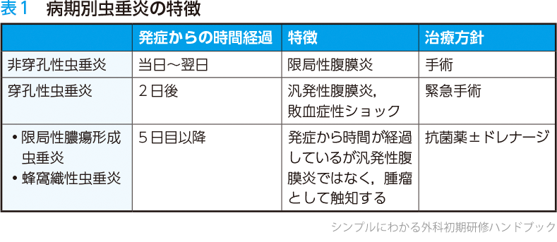 - 虫垂炎は病期によって特徴が異なる.病期と特徴,治療方針を表1にまとめた