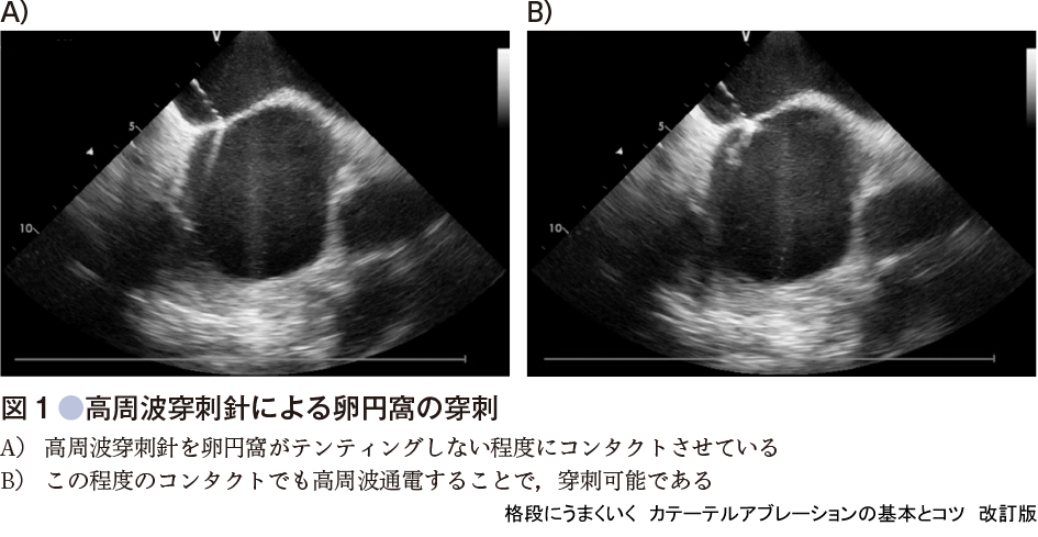 - 心房中隔穿刺は,心腔内エコーで卵円窩を確認しながら,高周波心房中隔穿刺針を用いて行う