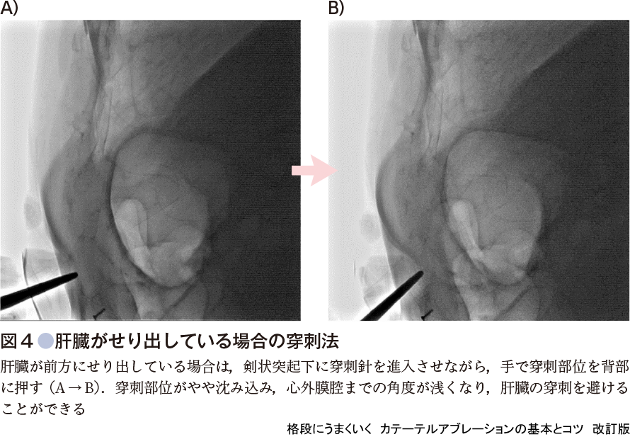 剣状突起-横隔膜,肝臓間のスペースは個人差が大きい(図3).肝臓が前方に張り出し,剣状突起と肝臓との間にわずかなスペースしかない症例も存在する(図3B).腹腔内出血を避けるために,横隔膜や肝臓を穿刺しないように注意する.そのためには,剣状突起もしくは胸骨柄の下縁を這わすように穿刺針を進める.
