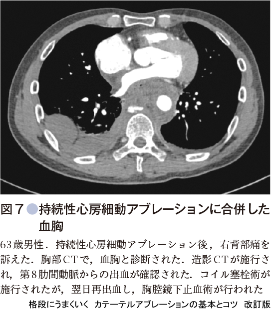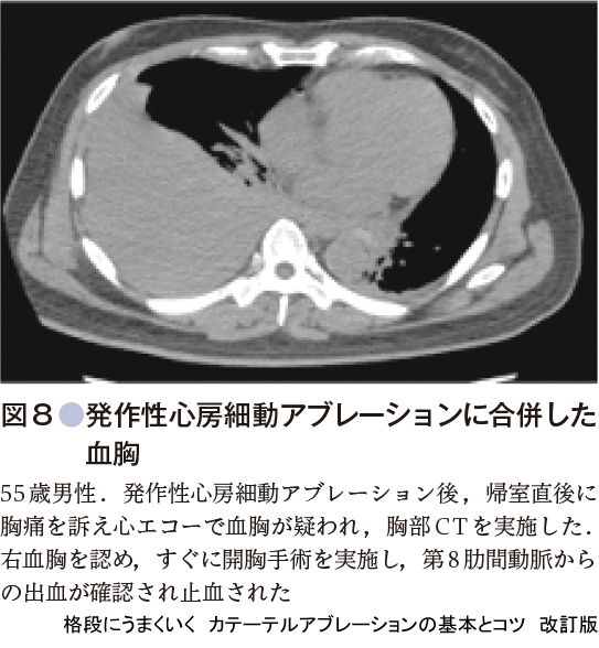 心房細動アブレーションに伴う血胸の合併率は,前述の世界規模の調査でも0.02%ときわめて稀である2).最近筆者らは(3施設)心房細動アブレーションに合併する血胸を3例(1症例/1施設)経験した.3施設合計の頻度は0.1%である.3例とも原因は第8肋間動脈の損傷であった.1例は死亡し,1例は肋間動脈コイル塞栓術を施行されたが,再出血し,胸腔鏡下止血術が行われ(図7),1例は開胸手術で止血術が施行された(図8).あとの2例は生存退院した.