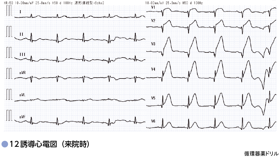 来院時,意識清明,顔貌は苦悶様.血圧154/82 mmHg,脈拍68回/分であった.来院時血液検査で白血球12,800/μL,CPK 210 U/L,CK-Mb 27 U/L,Cre 0.97 mg/dL,トロポニンT 0.108,総コレステロール200 mg/dL,中性脂肪332 mg/dL,HDLコレステロール38 mg/dL,LDLコレステロール216 mg/dLであった.12誘導心電図は以下の通りであった.冠動脈リスク因子として,喫煙20本/日.急性心筋梗塞を疑い,緊急で冠動脈造影検査施行したところ,左前下行枝#6に閉塞を認めた.引き続き,経皮的冠動脈インターベンション(PCI)を施行することとした.