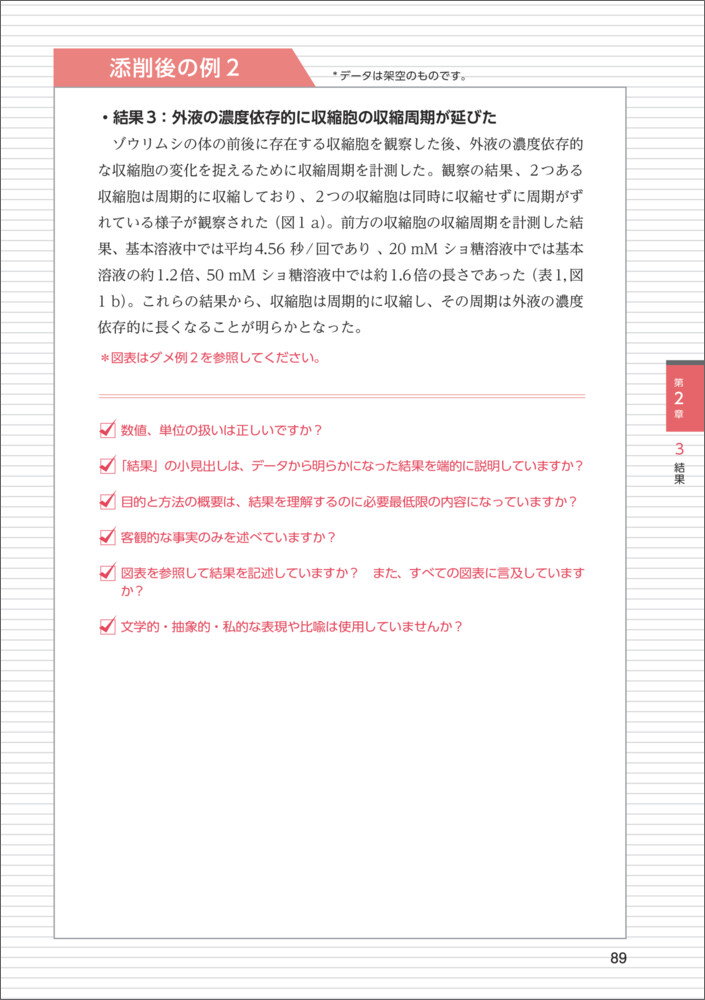 ②結果は文章で記す。図や表は、結果を説明する補助である。