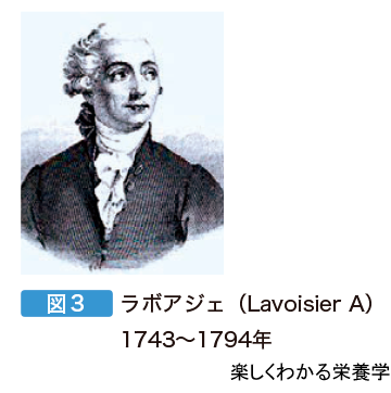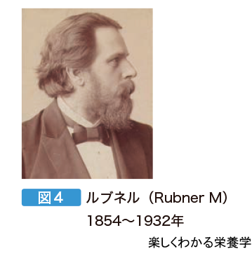 栄養学は,18世紀の後半,フランスの科学者ラボアジェ(図3)が,生体は呼吸により酸素を消費し,二酸化炭素を発生させること,およびその気体の量は発生する熱量(エネルギー)に比例することを証明したことから,その扉を開いた。エネルギー代謝量が食物摂取や労作により増大することを見出し,エネルギー代謝の基礎を築いたのである。1891年,ドイツ人のルブネル(図4)は,さらに,エネルギー代謝量★ が体表面積に比例することを見出し,糖質,脂肪,タンパク質が熱源となることも発見した。