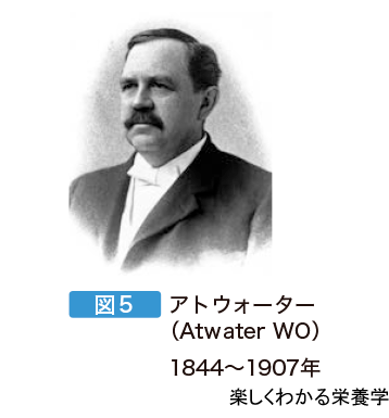 1903年,アメリカ人のアトウォーター(図5)は食品に含まれる熱量を直接測定できる装置を開発し,食品に含まれる栄養素の熱量は,1 gにつき炭水化物は4 kcal,脂質は9 kcal,タンパク質は4 kcalであることを見出し,アトウォーターのエネルギー換算係数を定めた。わが国においては,現在は国立健康・栄養研究所を中心にエネルギー代謝の研究がさかんに行われ,日本人のエネルギー消費量を算定する方法が検討された。