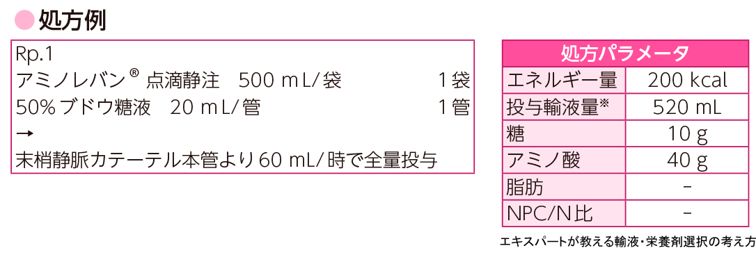 - TPN用キット製剤やPPN用キット製剤に加えてアミノレバン®点滴静注を用いる場合は,たんぱく投与量が過剰となる場合があるため注意する.必要に応じて,ハイカリック®RFや50%ブドウ糖液をベースに輸液を組み立てる