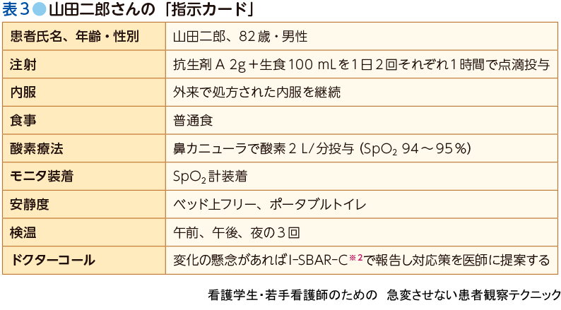 表2は医師が作成した診療計画を示します。また表3には医師の指示を示します。あなたは看護師として医師が作成した山田さんの診療計画と指示は論理的に正しいかどうかを検証します。診療の補助では医療行為や指示の内容について論理的な根拠を検証し、指示を行った場合は患者の反応を観察し変化を判断し変化に応じた適切な対応が必要になります。これらを前提に山田さんの診療計画と指示をチェックします。