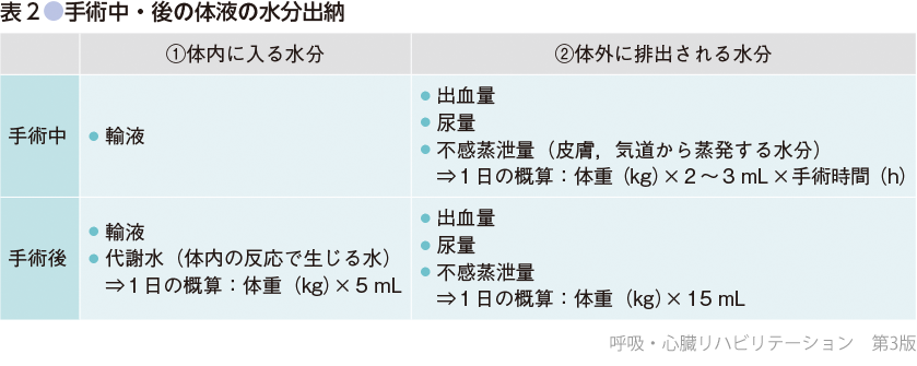 - 手術中・後の体液の水分出納を把握するために必要な項目を,①体に入る水分,②体から排出される水分,に分けて表2に示した.