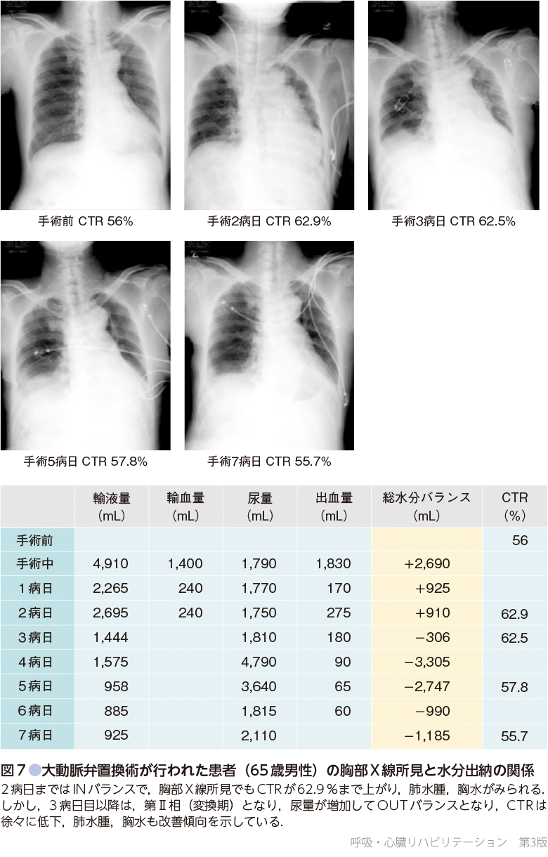 - 水分出納が把握できれば,体液が過剰な場合に生じやすい肺水腫,胸水など肺胞換気を低下させる要因の経過を予測しやすくなる.例えば,INバランスの場合,肺水腫や胸水は今後悪化し,肺胞換気も悪化することが予測される.逆に,OUTバランスであれば,それらの病態は改善の方向に向かうことが予測される(図7).