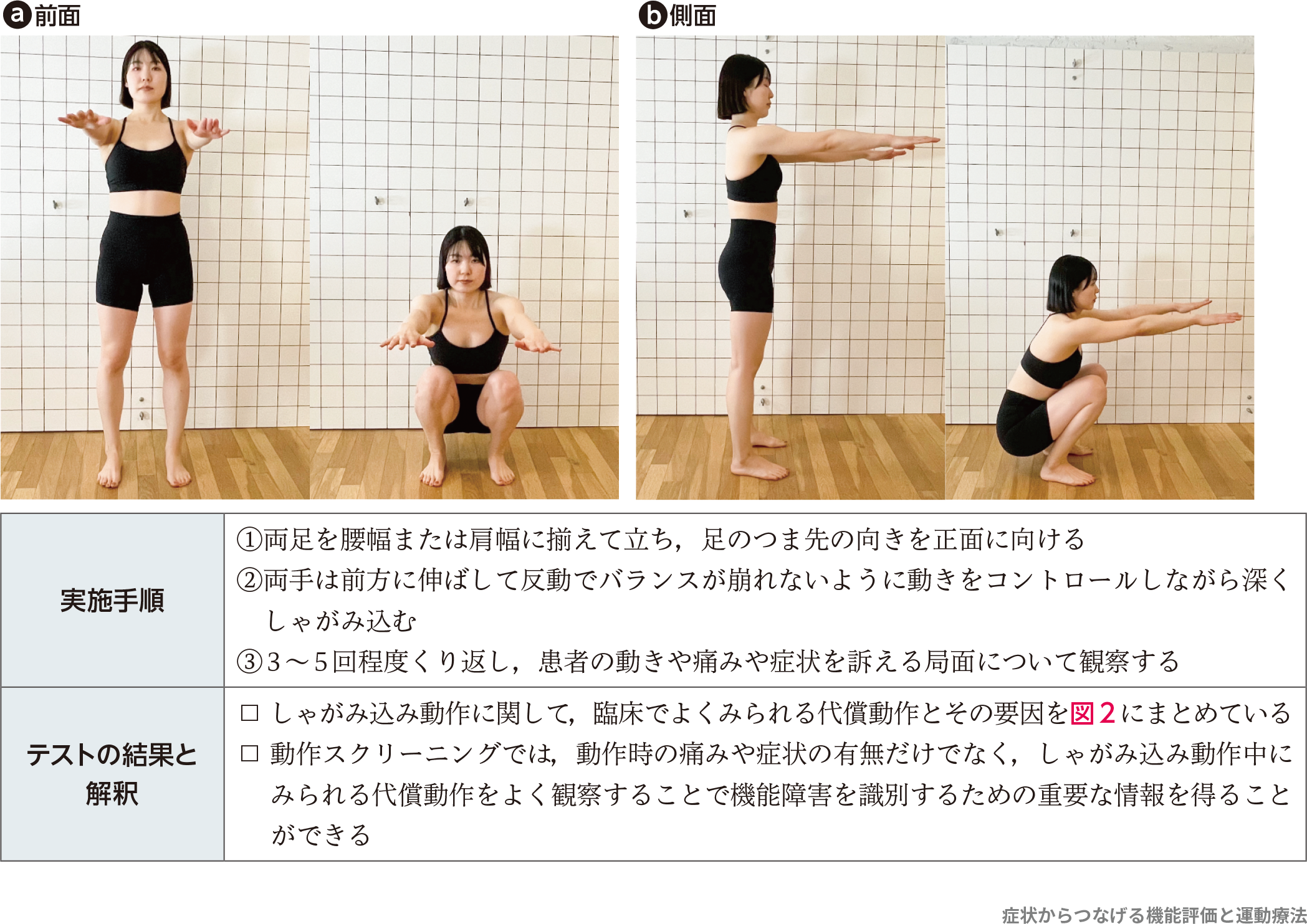 - STEP1ではしゃがみ込み動作のスクリーニングを行い,痛みや症状の有無だけでなく,代償動作も確認する.