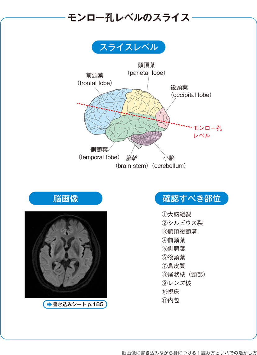 - 先輩PT:次はモンロー孔レベルのスライスを見ていこう。このレベルでは頭頂葉がほぼ見えなくなって、代わりに側頭葉が見えてくるよ。大脳皮質以外にも、基底核や間脳といった重要な部位がたくさん見えるのが特徴的だね。
