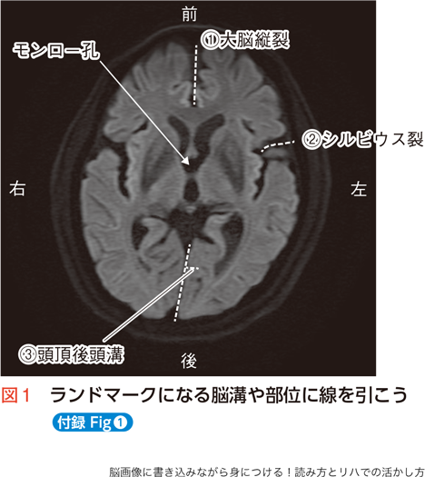 - 先輩PT:そうだね。でもいきなり内包を探しに行ってはいけないよ。まずはいつも通りランドマークになる脳溝や部位に線を引いていこう(図1)。
