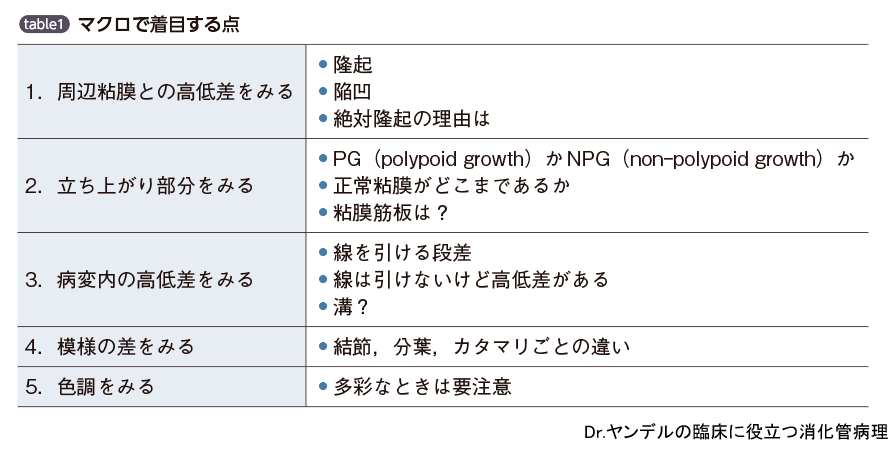 マクロ診断には,さまざまなやり方があります.たとえば,「内視鏡医であればレポートに記載しなければいけない項目」にこだわるやり方.「取扱い規約に掲載されている病理肉眼像をきちんと書けばそれで十分だろう」という考え方もあるでしょう.