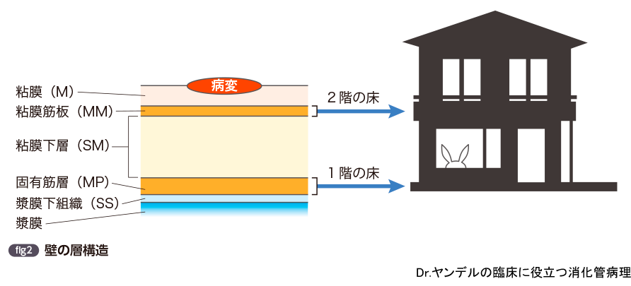 と並んでいますが,この中で最も重要なのは粘膜筋板です! この粘膜筋板の挙動をいかに読むかというのが,今後,進行癌から早期癌まで,あらゆる癌を読み切る際にきわめて重要になります.