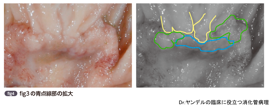 「fig4の緑線(―)の部分は,プツプツしている.ここには腺管構造があるだろう.粘膜が細かくプツプツするときは基本的に腺管があるときだからな.プツプツ度合いは周囲の正常粘膜とは異なっているし,色調も少し違う.すなわちここには,『不整な腺管』があるに違いない.つまり癌だ」