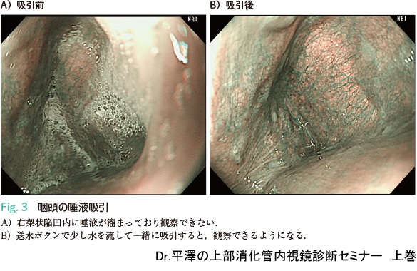 - :咽頭麻酔前にうがいをしてもらうと唾液が少なくなります.検査中も唾液をやさしく吸引して観察します(Fig. 3).送水ボタンで送水をして,その水と一緒に唾液を吸引することも有効です.もちろん,鉗子口から水を流すと,気管に入ってしまうのでダメです.