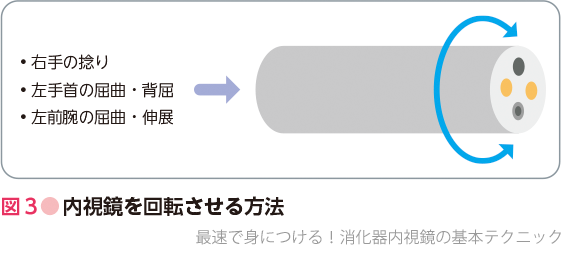 内視鏡の回転は「右手の捻り」,「左手首の屈曲・背屈」,「左前腕の屈曲・伸展」の動作で行います(図3).