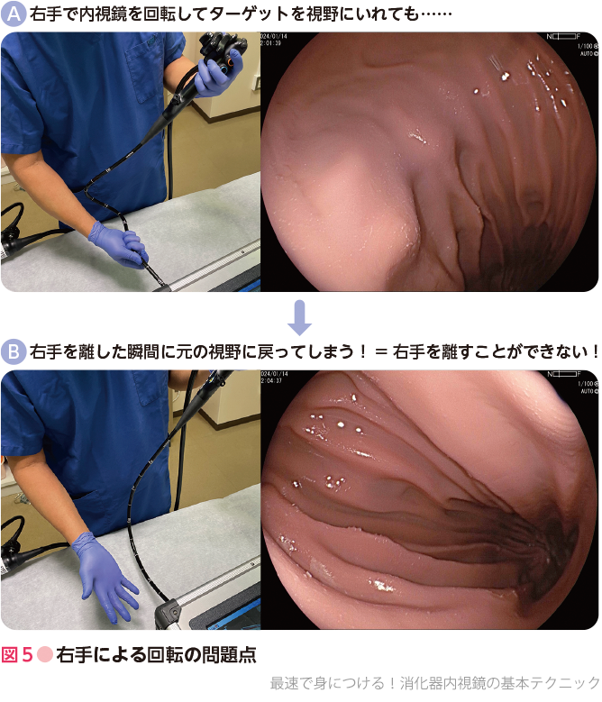 基本的に右手を捻る動作は用いません(図4).右手を捻ることで視野を確保した場合,右手を離すことができなくなり生検鉗子などを自分の右手でコントロールできなくなるためです(図5).
