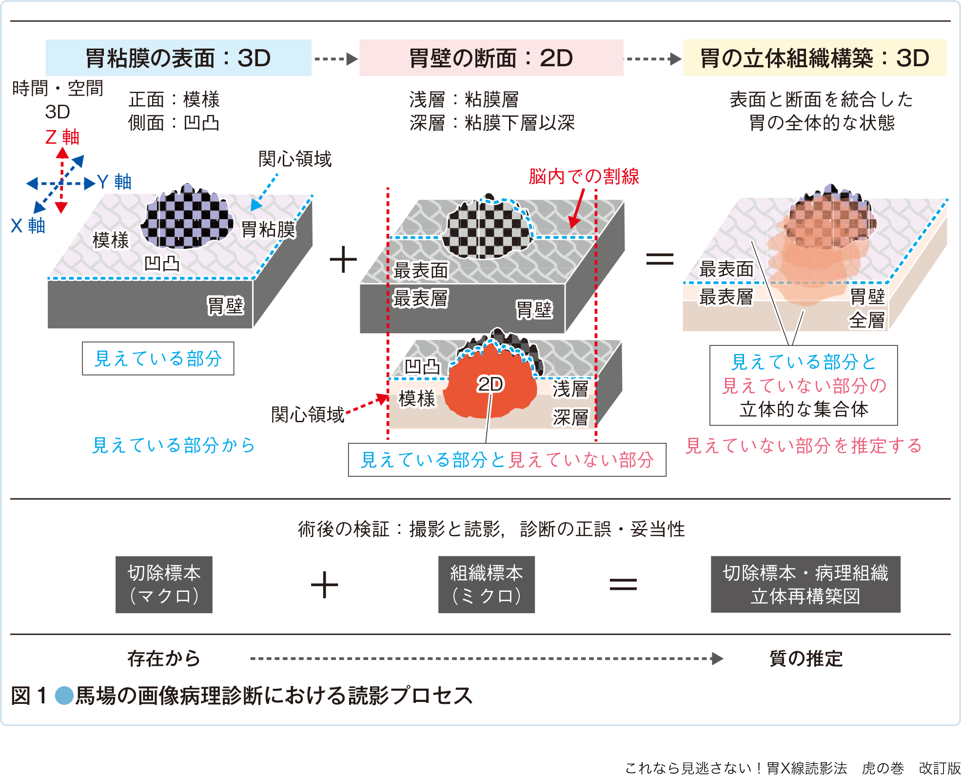 まず,誰もが見えている画像上の胃粘膜表面形態の模様・凹凸像の存在を立体的にとらえます.次に,とらえた像を脳内で思考し解釈や分析を行った所見に基づいて,見えていない胃壁の断面を推定します.最終的に表面と断面を統合した全体的な判定を行い,胃の立体組織構築とその質を推定するまでが,基準読影法の作業工程となります.