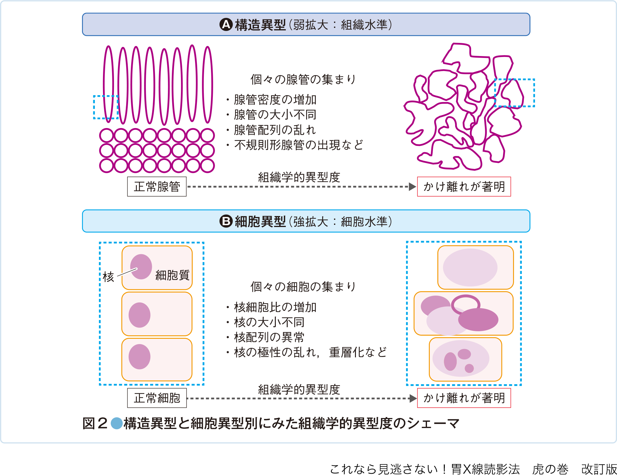 中村の胃癌の構造によると,日常の病理組織学的な良性・悪性の判断は,究極的には“異型”をもってなされていると述べています.また,異型を正常組織からの形態的なかけ離れとし,異型には構造異型と細胞異型という2つの観察水準があり,それぞれ正常組織からどれくらいかけ離れているかを総合的に眺めて,“異型度”というものを判断しているとされています(図2).